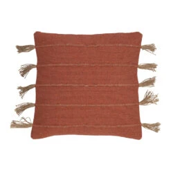 Les détails en jute, comme les rayures discrètes et les pompons latéraux, ajoutent une touche artisanale et raffinée qui s’accorde parfaitement avec une décoration bohème ou rustique.